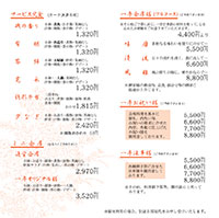 小鉢・前菜・お造り・揚物・陶板焼き・煮物・酢肴・汁物・御飯・香の物・デザート